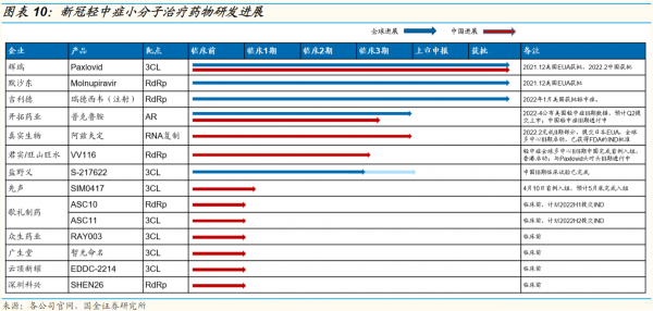 在我國,針對新冠輕中症的小分子藥物研發也取得了較快進展。目前研發進度較快的包括開拓藥業的口服藥普克魯胺、真實生物的口服藥阿茲夫定、君實生物的口服藥VV116均已進入3期臨牀,進入臨牀階段的還有先聲藥業的口服藥SIM0417,更多小分子口服藥處於臨牀前階段。