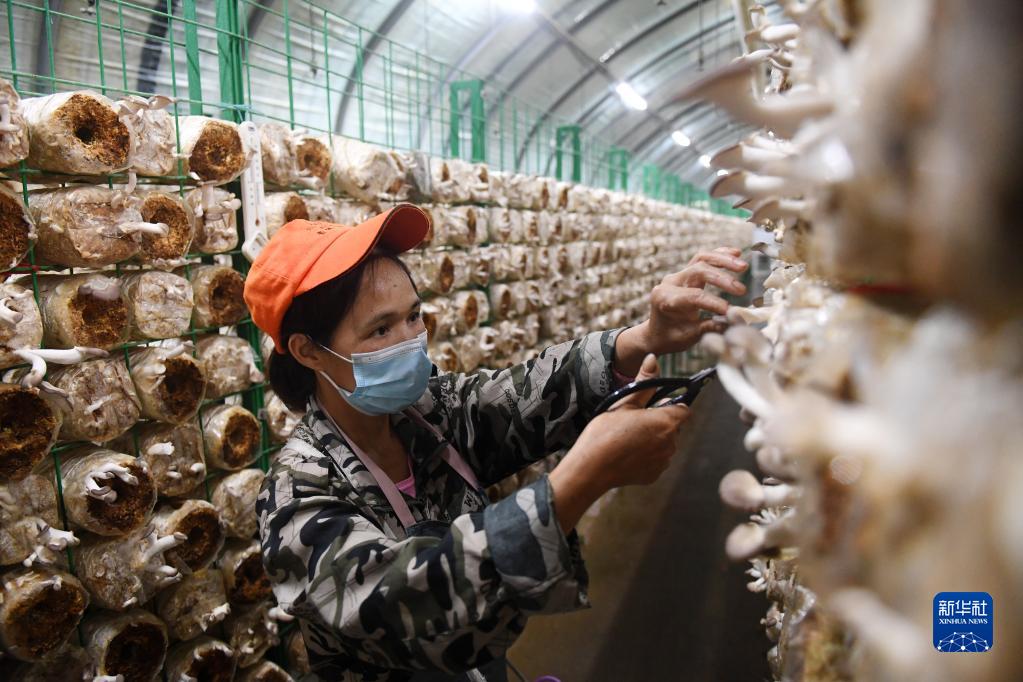 在廣西東蘭貴隆生態農業科技有限公司食用菌產業園,工作人員在採摘食用菌(5月6日攝)。