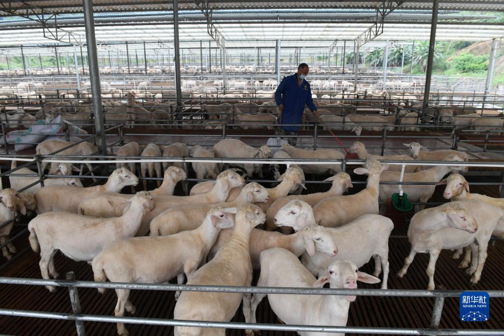 在廣西東蘭縣武篆鎮東里村澳寒羊養殖基地,工作人員在清理羊舍(5月6日攝)。