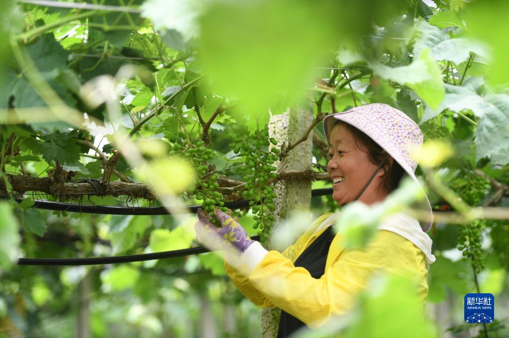 在廣西東蘭縣武篆鎮東里村葡萄園,工作人員在管護葡萄(5月6日攝)。