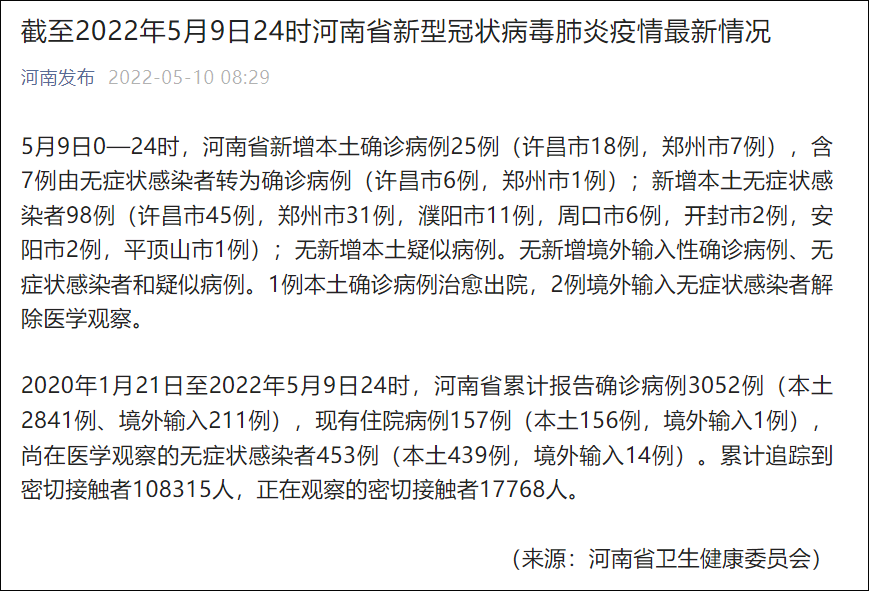 微信公眾號“河南發佈”消息,5月9日0—24時,河南省新增本土確診病例25例(許昌市18例,鄭州市7例),含7例由無症狀感染者轉為確診病例(許昌市6例,鄭州市1例);新增本土無症狀感染者98例(許昌市45例,鄭州市31例,濮陽市11例,周口市6例,開封市2例,安陽市2例,平頂山市1例);無新增本土疑似病例。無新增境外輸入性確診病例、無症狀感染者和疑似病例。1例本土確診病例治癒出院,2例境外輸入無症狀感染者解除醫學觀察。