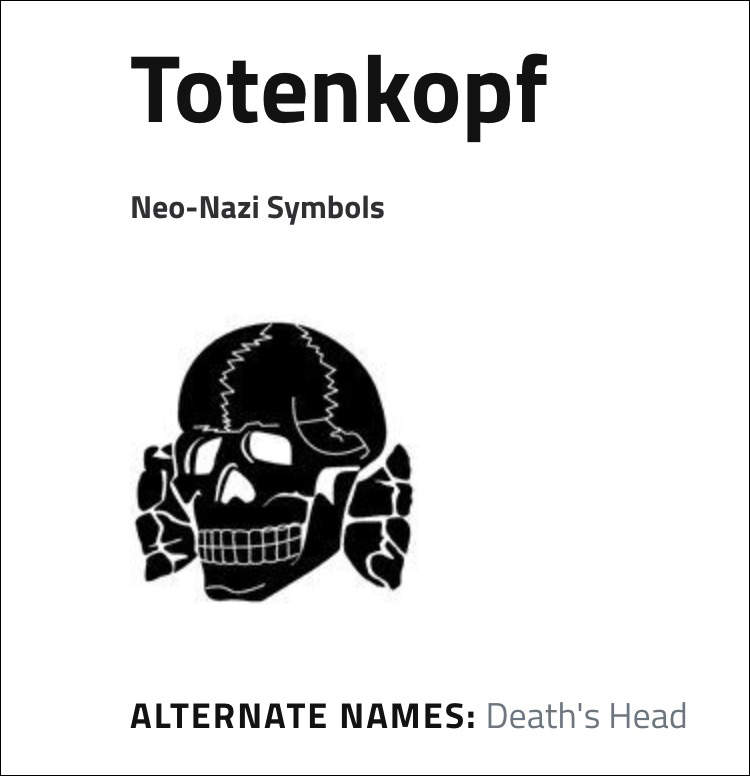 據反仇恨組織“ADL”網站介紹,“Totenkopf”在德語中是“死亡之頭”或頭骨的意思。在納粹時代,希特勒的黨衞軍採用了“骷髏頭”形象作為標誌。