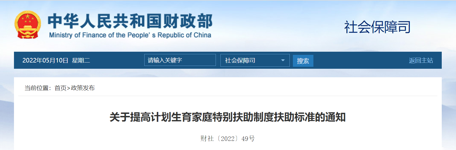 為貫徹落實《中共中央 國務院關於優化生育政策促進人口長期均衡發展的決定》精神以及《財政部 衞生計生委關於進一步完善計劃生育投入機制的意見》(財社〔2016〕16號),切實維護好計劃生育家庭合法權益,經研究,決定自2022年7月1日起,提高計劃生育家庭特別扶助制度扶助標準。現將有關事項通知如下: