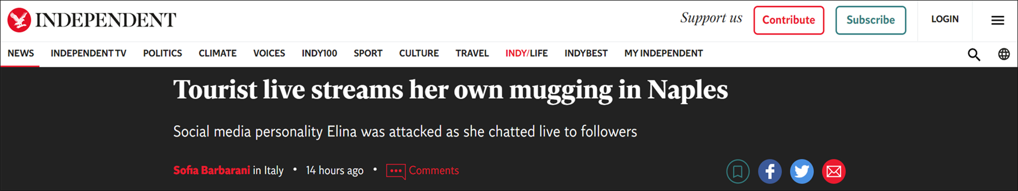 《獨立報》:一名遊客在那不勒斯直播了自己被搶劫的過程