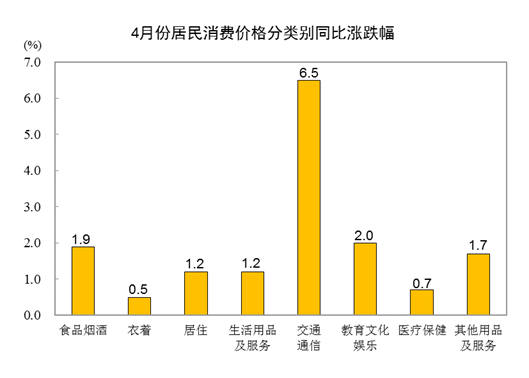 其他七大類價格同比均上漲。其中,交通通信、教育文化娛樂、其他用品及服務價格分別上漲6.5%、2.0%和1.7%,居住、生活用品及服務價格均上漲1.2%,醫療保健、衣着價格分別上漲0.7%和0.5%。