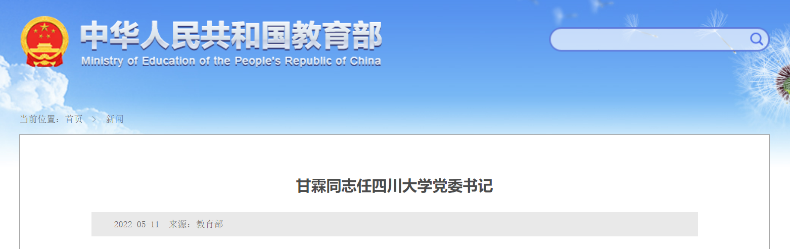 教育部網站5月11日消息,日前,中央決定:甘霖同志任四川大學黨委書記;因年齡原因,王建國同志不再擔任四川大學黨委書記職務。5月11日上午,四川大學召開教師幹部視頻會議。中央組織部副部長、中央編辦主任李小新同志到會宣佈中央決定並講話,教育部黨組成員、副部長田學軍同志,四川省委常委、組織部部長於立軍同志出席會議並講話。四川大學校長、黨委副書記李言榮同志主持會議。