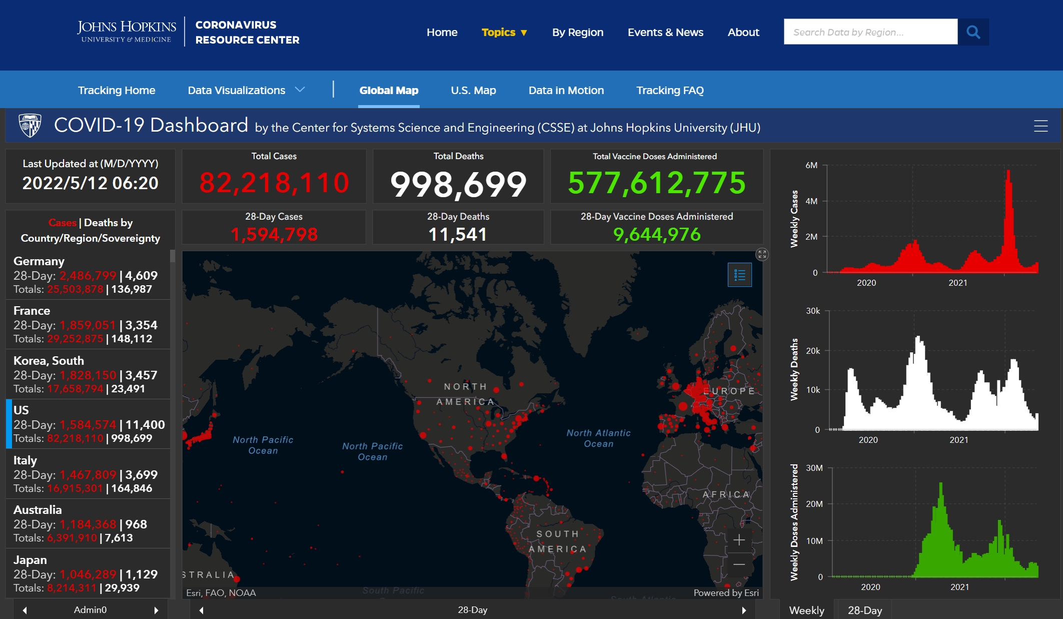 (觀察者網訊)根據美國約翰斯·霍普金斯大學統計數據,截至北京時間5月12日6時20分,美國新冠肺炎累計感染病例達到82218110例,累計死亡病例達到998699例。在過去約24小時裏,美國新增感染病例111910例,新增死亡病例361例。
