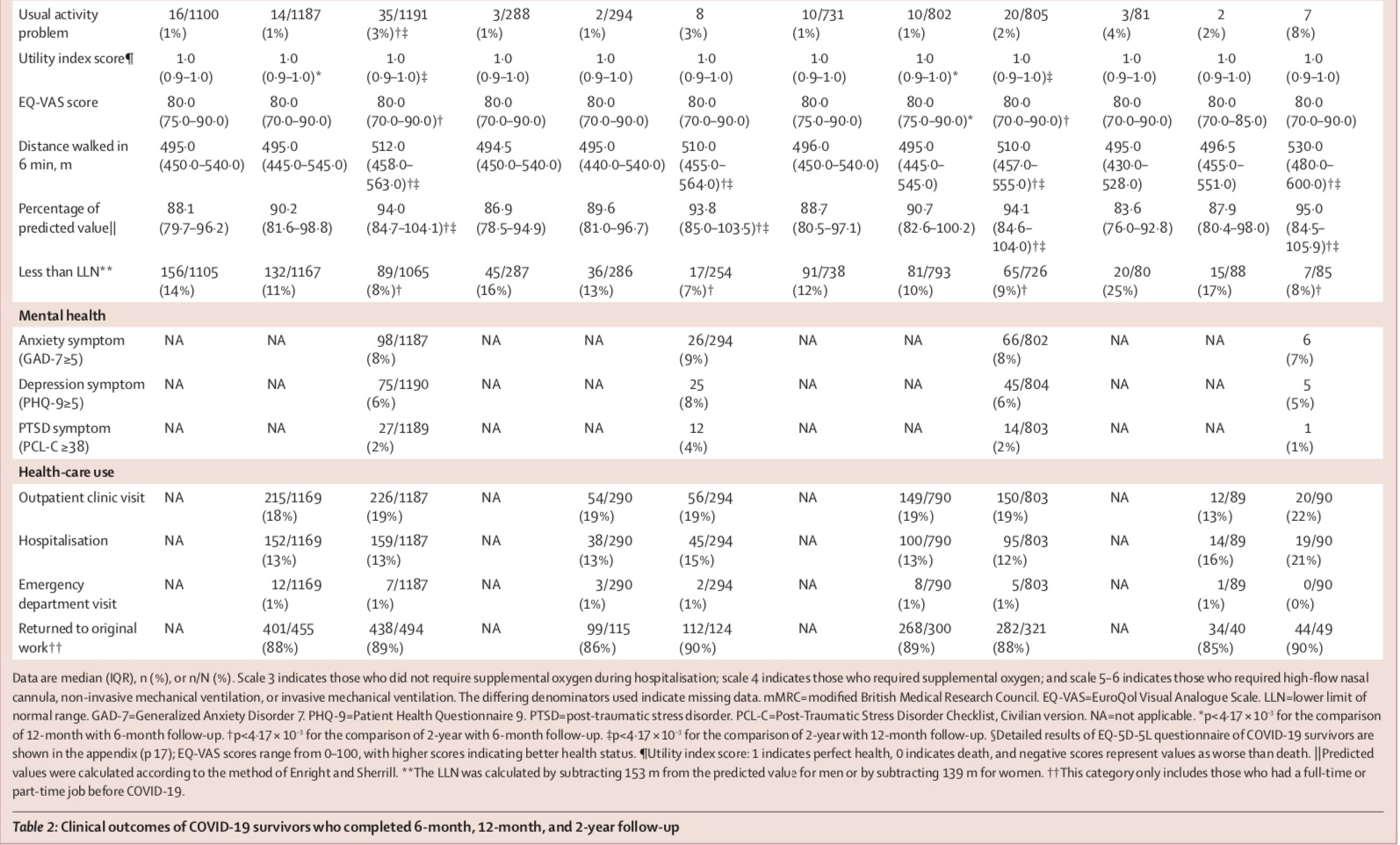 在生活質量調查問卷中,相比非COVID-19參與者,COVID-19患者也更經常報告疼痛或不適和焦慮或抑鬱。不過,研究也同時提到,與健康相關的生活質量在幾乎所有領域都持續改善,尤其是在焦慮或抑鬱方面:出現焦慮或抑鬱症狀的個體比例從6個月時的23%(256/1105)下降到2年時的12% (143/1191) 。