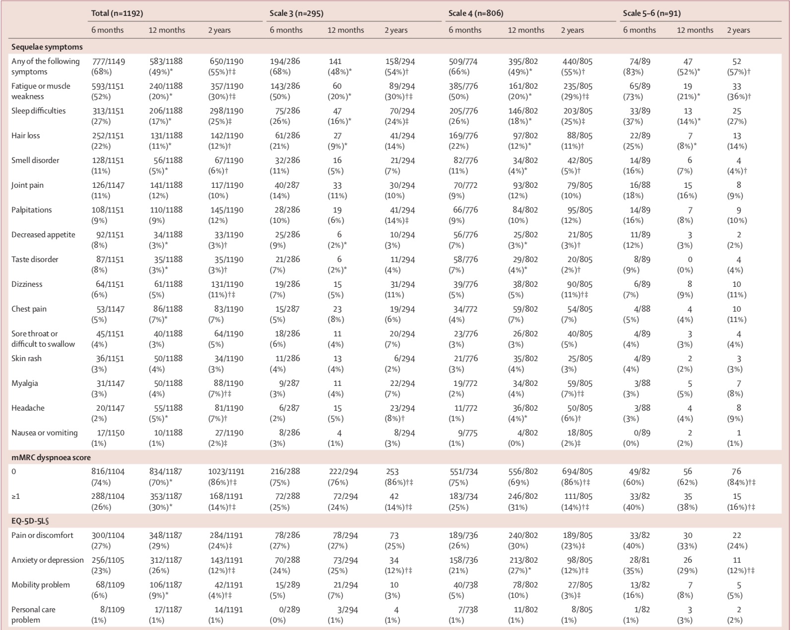 在最初發病2年後,COVID-19患者的健康狀況通常比普通人羣差,31%(351/ 1127)報告疲勞或肌肉無力,31%(354/1127)報告睡眠困難。非COVID-19參與者報告這些症狀的比例則分別為5%(55/1127)和14%(153/1127)。COVID-19患者也更有可能報告一些其他症狀,包括關節疼痛、心悸、頭暈和頭痛。