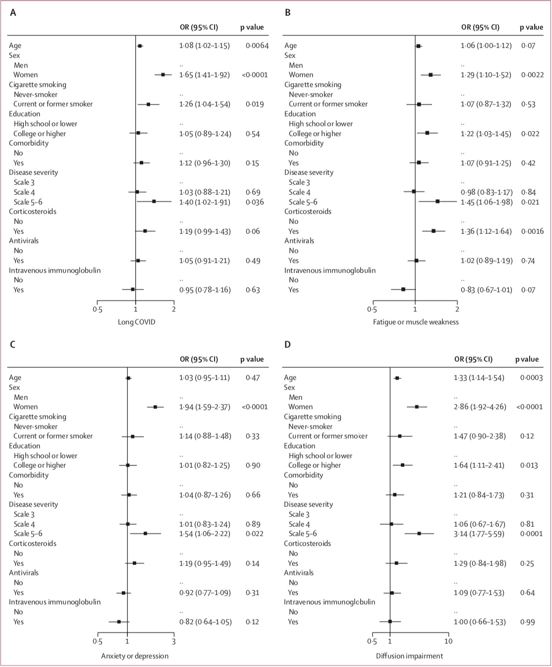 長COVID、疲勞或肌無力、焦慮或抑鬱、肺彌散性損傷的危險因素。