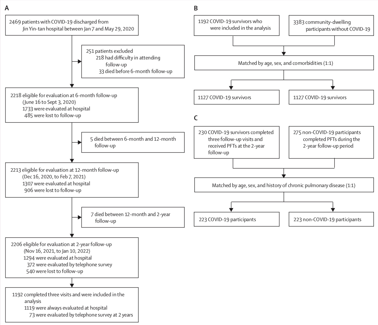 研究提到,2020年1月7日至2020年5月29日期間,武漢金銀潭醫院COVID-19患者出院共計2469例。其中1192名倖存者在三次隨訪中完成評估並納入最終分析,其中1119人(94%)在感染後2年接受面對面訪談。隨訪時間包括6個月、12個月和2年。