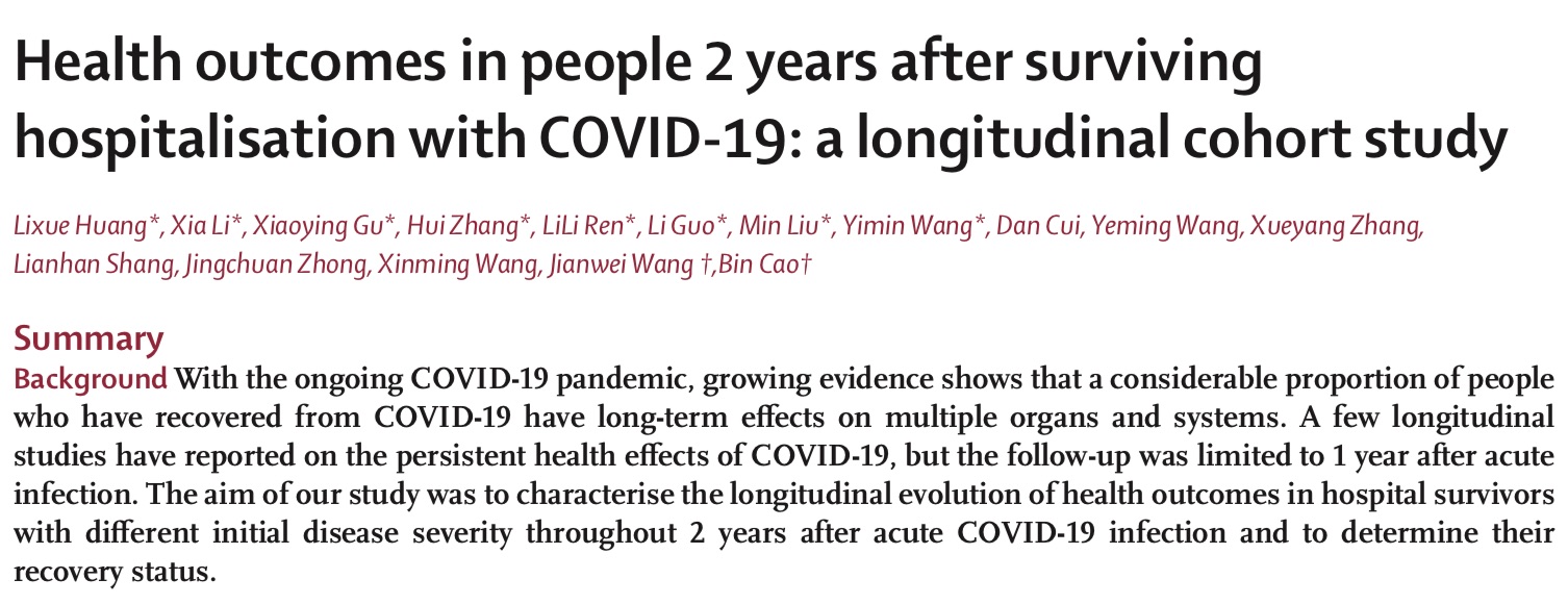 中國團隊的一項最新研究報道了不同嚴重程度的新冠住院倖存者在急性COVID-19感染後2年內健康結局的縱向演變。這項迄今最長的新冠患者隨訪研究由中日友好醫院曹彬教授、中國醫學科學院北京協和醫學王健偉教授率領的團隊完成。該項研究於北京時間5月12日在線發表於《柳葉刀呼吸醫學》(Lancet Respiratory Medicine),題為**“COVID-19患者住院治療後2年的健康結局:一項縱向隊列研究”**(Health outcomes in people 2 years after surviving hospitalisation with COVID-19: a longitudinal cohort study)。