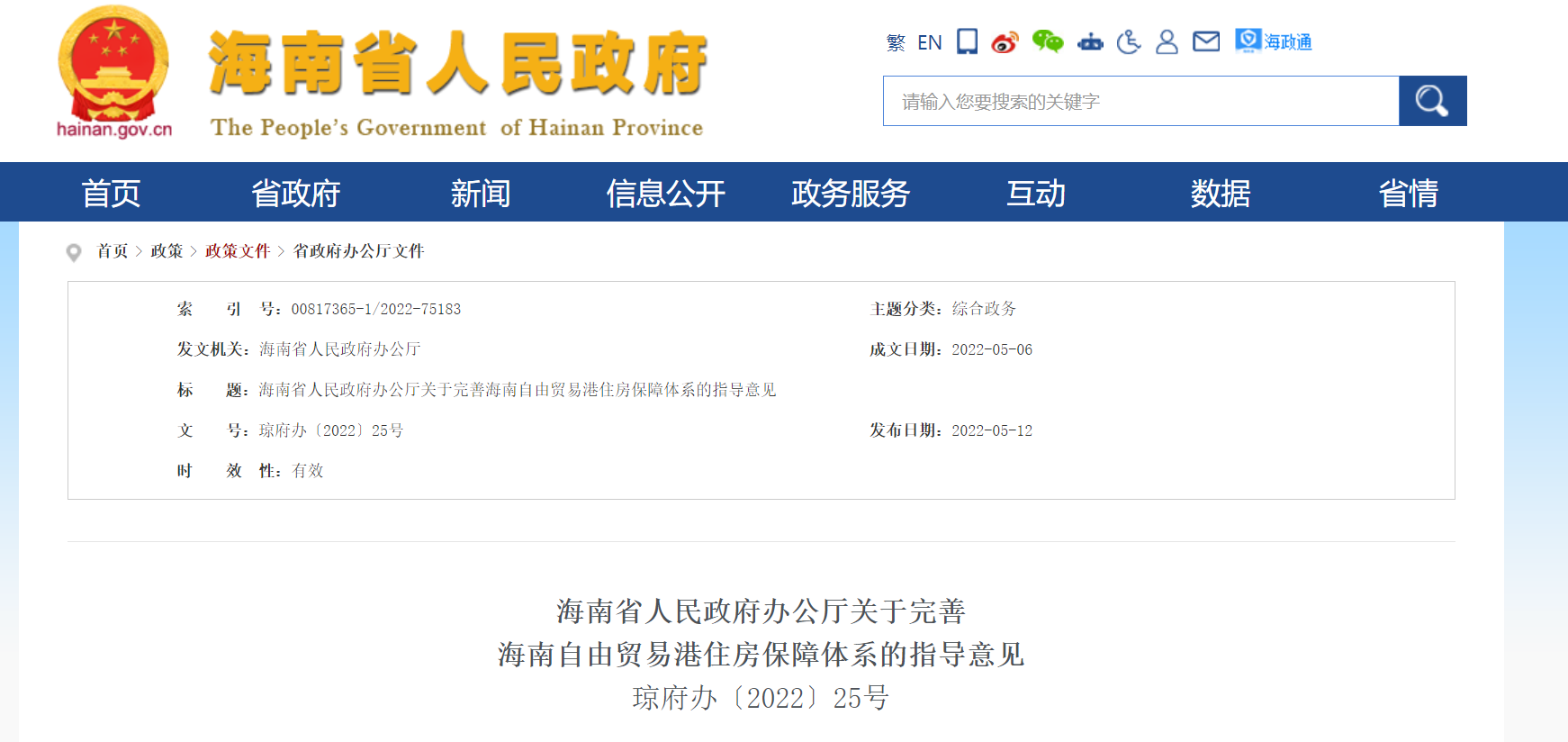 海南省人民政府網站5月12日消息,海南省人民政府辦公廳發佈關於完善海南自由貿易港住房保障體系的指導意見。