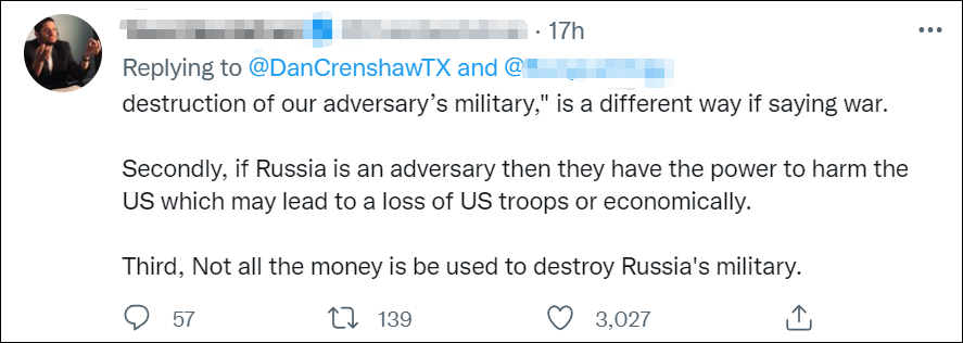 “‘摧毀我們敵人的軍隊’,如果就戰爭而言,得是另一種方式。其次,如果俄羅斯是敵人,那麼他們有能力傷害美國,這可能導致美軍或經濟損失。第三,並不是所有(援助烏克蘭)的錢都被用來摧毀俄羅斯的軍隊。”