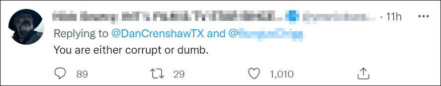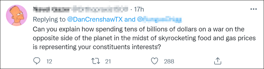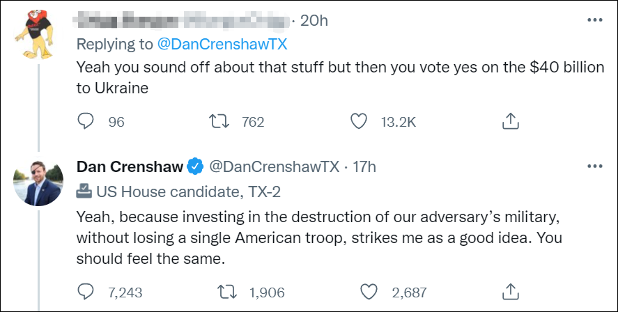 有人問美國議員為什麼給400億美元烏克蘭援助計劃投贊成票,這是他的回答。此人是得克薩斯州共和黨眾議員丹·克倫肖(Dan Crenshaw),他的這番言論不僅招致同黨人的批判,指責他正在資助一場“與俄羅斯的代理人戰爭”,還被其他美國網民怒罵。