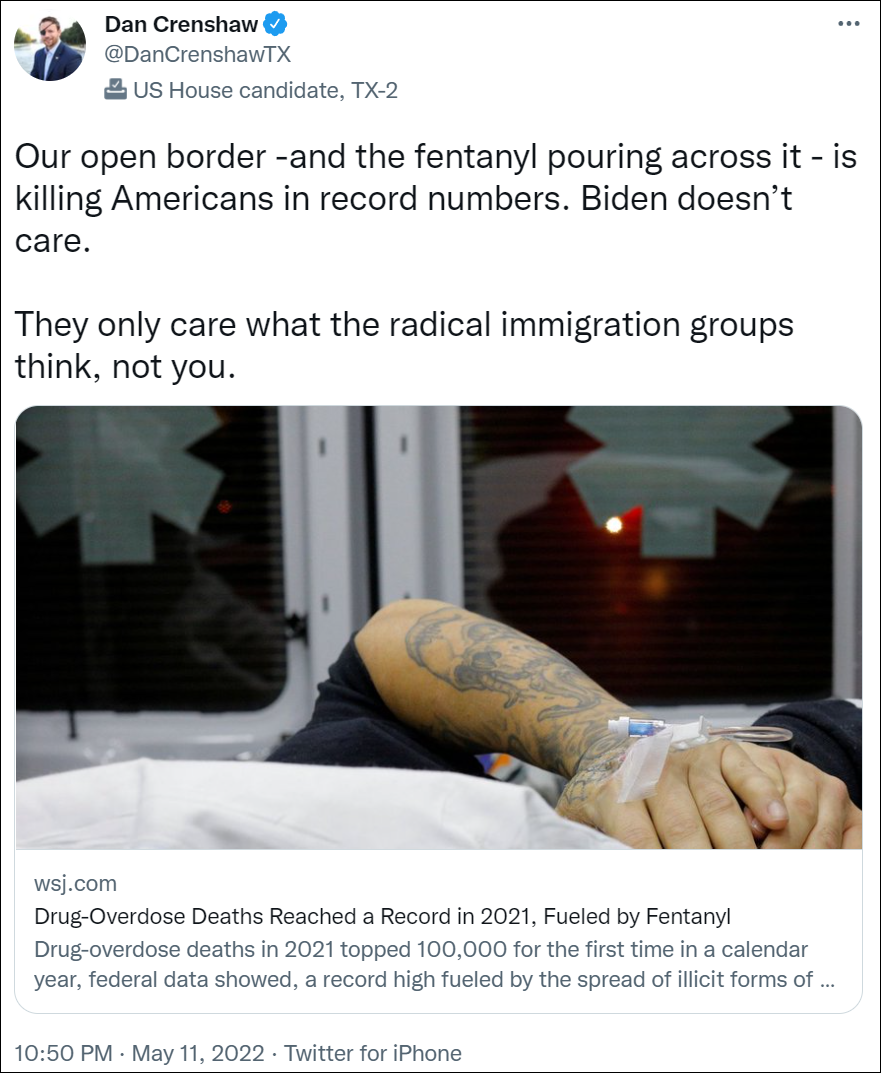 當地時間11日,克倫肖在推特轉發了《華爾街日報》的一篇報道,內容是美國2021年藥物過量死亡人數歷年來首次超過10萬人,其中2/3的人死於過量服用芬太尼等合成阿片類藥物。報道稱,這是由於非法形式的芬太尼在全美流通,而它們主要由墨西哥毒販生產。