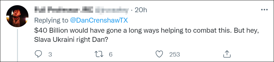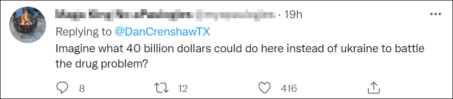 結果,克倫肖這條推文的評論區卻“翻車”了,不少人都在問他,既然他如此反對拜登,又關心美國藥物濫用問題,那為何要投票支持拜登的400億美元烏克蘭援助計劃。