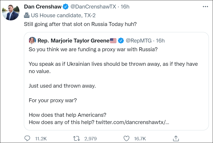就連同黨人也注意到此事,並對克倫肖進行炮轟。來自喬治亞州的共和黨眾議員瑪喬麗·泰勒·格林(Marjorie Taylor Greene)就在推特發文,指責克倫肖正在資助一場“與俄羅斯的代理人戰爭”。