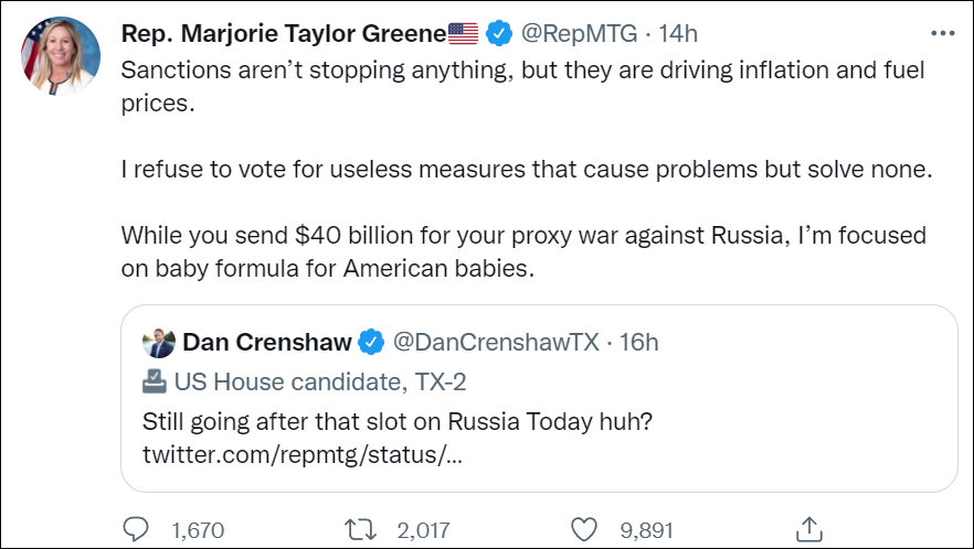對此,格林也回擊稱:“制裁並沒有阻止任何事情,但卻推高了通貨膨脹和燃料價格。我拒絕投票支持造成問題卻不能解決問題的無用措施。當你為你對俄羅斯的代理戰爭支付400億美元時,我專注於解決美國嬰兒的配方奶粉問題。”