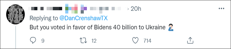面對網民們的質疑,克倫肖通過回覆其中一條高贊評論進行回應。這條高贊評論對克倫肖嘲諷道:“是的,你説了這麼多,但然後你又對給烏克蘭的400億美元投了贊成票。”