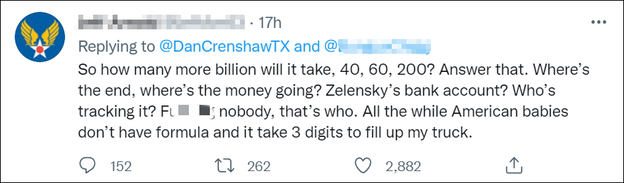 許多人紛紛指出,美國債台高築且通脹嚴重,食品、汽油價格飛漲,嬰兒還吃不上配方奶粉,在此情況下美國援助烏克蘭令他們十分不滿。有人還火大質問,這種援助何時能有盡頭。