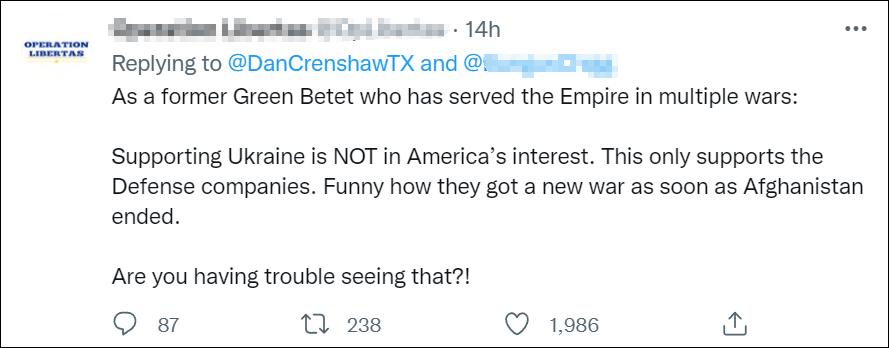 “作為一名曾在多場戰爭中為國家效力的前綠色貝雷帽(指美國陸軍特種部隊成員)要説:支持烏克蘭不符合美國的利益。這隻有利於國防公司。有趣的是,阿富汗戰爭一結束,他們就發動了一場新的戰爭。你看不清楚嗎?!”