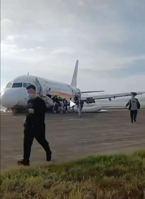 通過旅客在現場拍攝的視頻,我們得以瞭解飛機的撤離情況。在飛機衝出跑道停下後,機上乘務員立即組織了人員撤離。現場視頻顯示,最先開啓的緊急疏散門是左前方艙門,即平時上下客的艙門,緊接着尾部左側艙門也打開應急滑梯釋放。在左前方應急滑梯疏散時飛機左側燃起大火,隨後停止前方疏散,轉為機尾疏散。