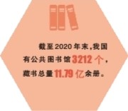 數據統計,截至2020年末,我國有公共圖書館3212個,藏書總量11.79億餘冊,實際使用房屋建築面積1785.77萬平方米,平均每萬人公共圖書館建築面積為126.49平方米。
