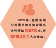 數據顯示,全國各級公共圖書館普遍開展講座、展覽、閲讀指導、讀書交流、演講誦讀等活動。僅2020年,各地公共圖書館就為讀者舉辦各種活動150713次,有9279.33萬人次參加。
