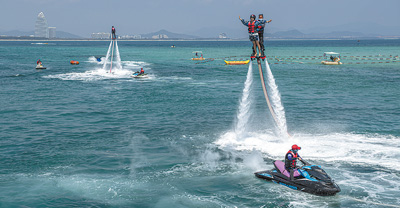 海南省三亞市蜈支洲島景區,遊客在體驗水上項目。