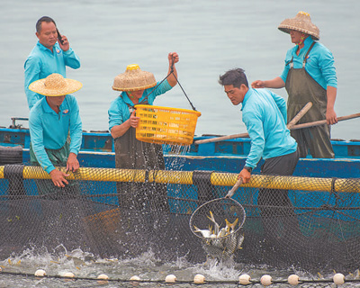 海南省三亞市西島海域深水網箱養殖基地,漁民在捕魚。 袁 琛攝(人民視覺)