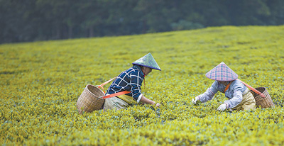 海南省白沙黎族自治縣原生態茶園小鎮,白沙農場的職工在採茶。 李天平攝(人民視覺)
