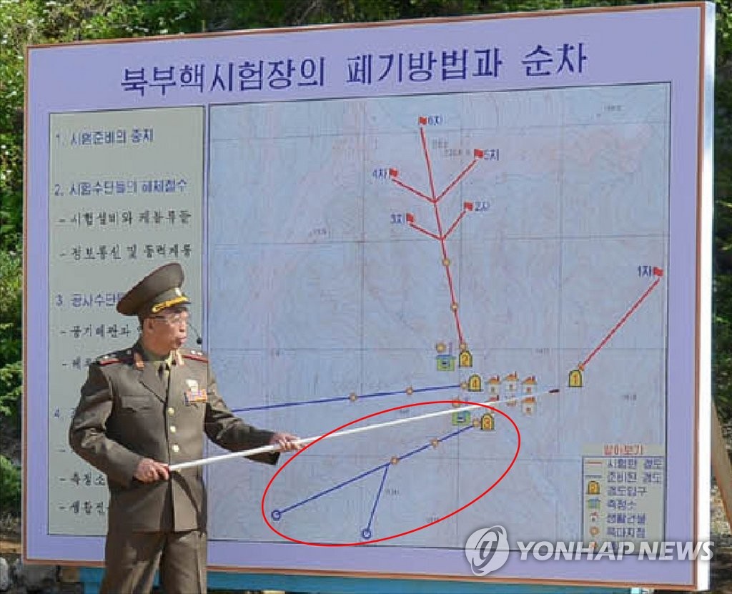 2018年5月24日,朝方邀請外媒記者,介紹豐溪里核試驗場爆破計劃 圖自韓聯社