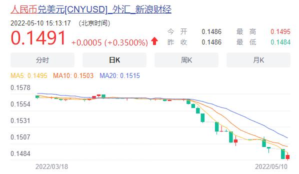 今年年初的時候,美國10年期國債收益率是1.63%,中國10年期國債收益率是2.81%,中美兩國國債的利差是1.18%。到了4月19日的時候,美國10年期國債收益率是2.93%,中國10年期國債收益率是2.85%,中美國債利差是-0.08%,發生罕見的倒掛。而人民幣兑美元的匯率也從4月19號開始由6.39跌到一週以後的6.68附近,跌幅接近5%。