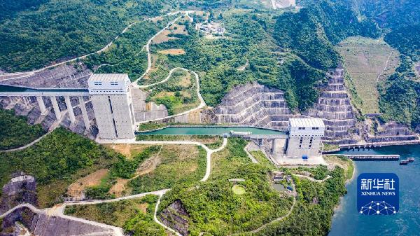 500噸級標船通過遵義市構皮灘水電站通航工程中間渠道駛向上游第一級承船廂(2021年6月22日攝,無人機照片)。新華社記者 陶亮 攝