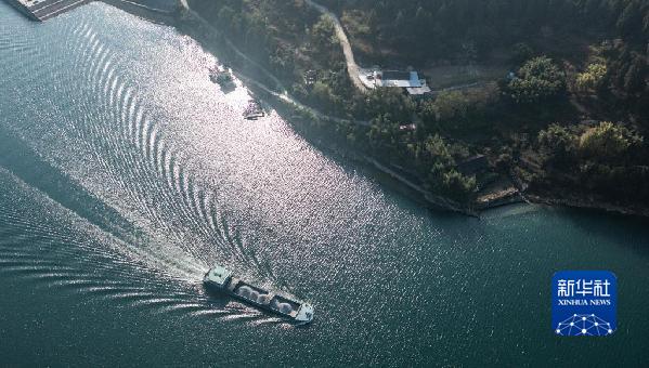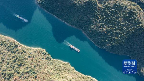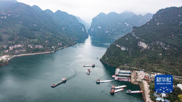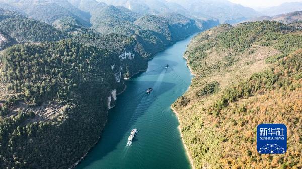 運載磷礦石的貨船沿烏江航道順流航行(2021年11月18日攝,無人機照片)。新華社記者 陶亮 攝