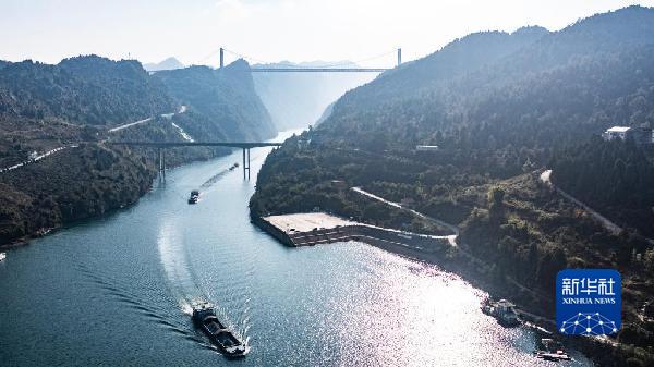 近年來,構皮灘、思林、沙沱電站大型升船機相繼投入運行,烏江水道全面貫通。2021年11月,貴陽港開陽港區北上長江首航,14艘貨船運載6800噸磷礦,從貴陽港開陽港區出發,前往重慶涪陵。這標誌着烏江“黃金水道”全線大規模復航,500噸級船舶可直達長江。