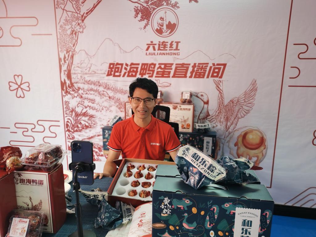 六連村食品廠負責人莫澤錦通過網絡直播銷售鹹鴨蛋。 新華社記者趙葉蘋攝