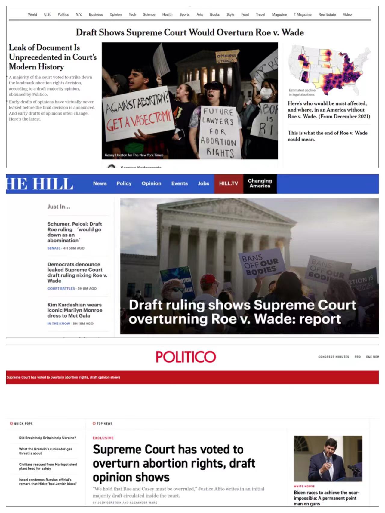 從阿利托的判決書草稿來看,用詞非常尖鋭,不僅完全推翻了前代法官的邏輯,也沒有顧及少數派的感受,幾乎是率性而為。如果該草稿不被曝光,經過修改軟化之後再定稿,雙方的矛盾就仍然還有回還的餘地。曝光之後,就算阿利托想退後,在保守派勢力眼裏也會失分。自由派那邊面對如此尖鋭的草稿,如果最終的少數派意見不能夠強勢回應,在自由派勢力那裏也無法交待。無形之中,無論曝光人的最初動機是什麼,都在客觀上助推了兩派法官的矛盾。