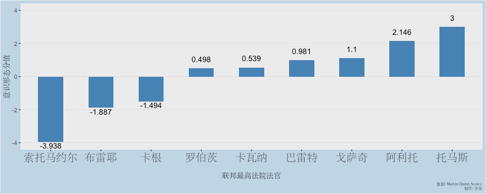 高院分配一個判決的主筆法官的原則是,如果首席大法官處於多數派一邊,就由首席大法官指定;如果首席大法官處於少數派一邊,就由多數派中資歷最老的法官來指派。下圖是美國政治學界對大法官意識形態傾向的最新測量值。負分越高,自由派傾向越強,反之,正分越高,則保守派的傾向越強。