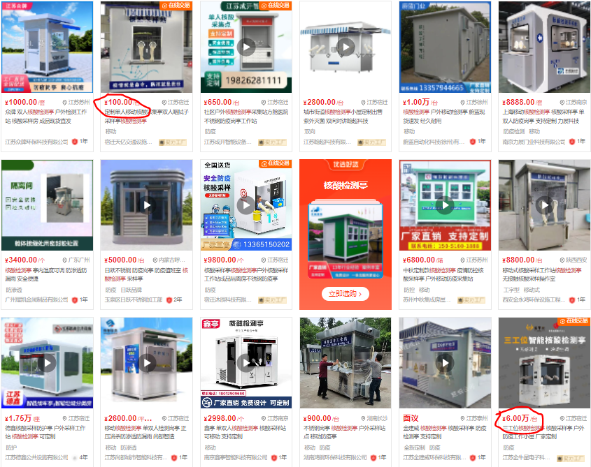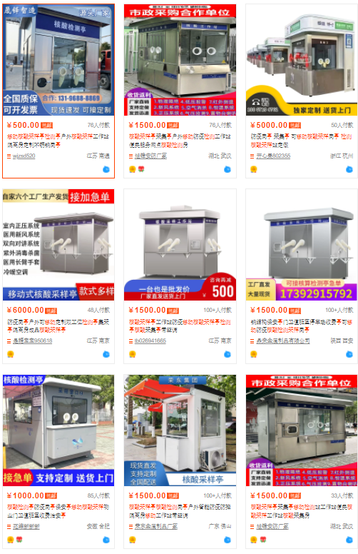 那麼,核酸檢測亭到底的利潤空間有多大?記者以關鍵詞“移動核酸檢測採樣亭”查詢了首淘寶上的價格,生產商的報價紊亂,每台最低報價39元,最高68000元,中位數價格5000元左右。