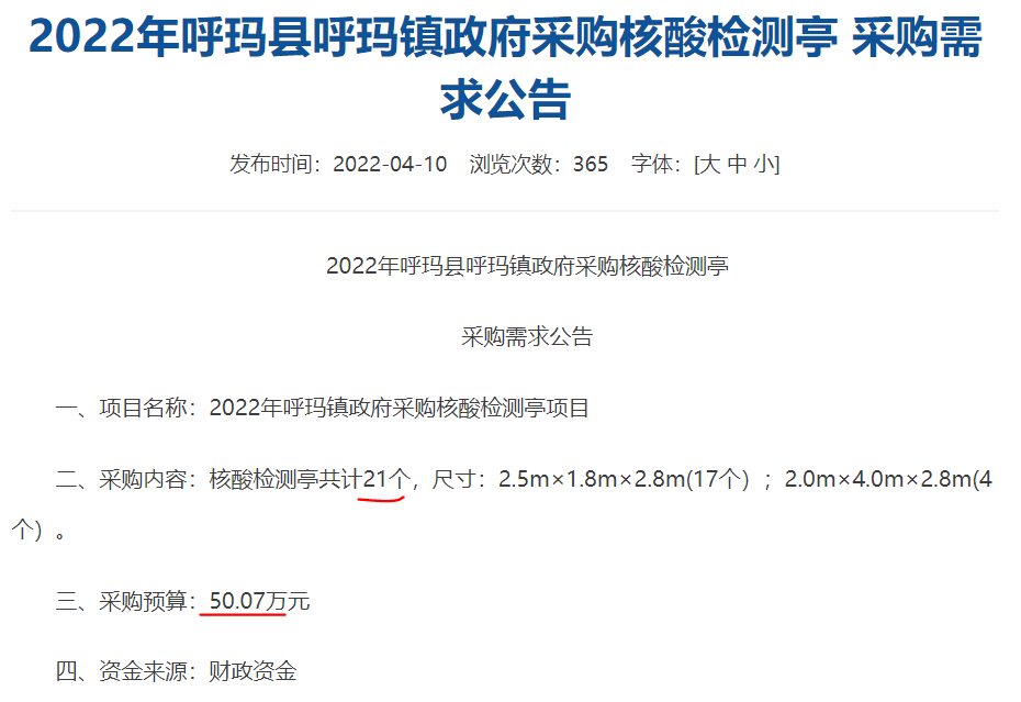 而公開資料上顯示,各地核酸檢測亭的政府招標採購價在2萬元至5萬多不等。5月8日中國政府採購網發佈《呼瑪縣呼瑪鎮人民政府發佈核酸檢測亭項目競爭性磋商公告》,公告顯示其擬採購核酸檢測亭共21個,預算金額507,000元,單價約為24,000元/台。
