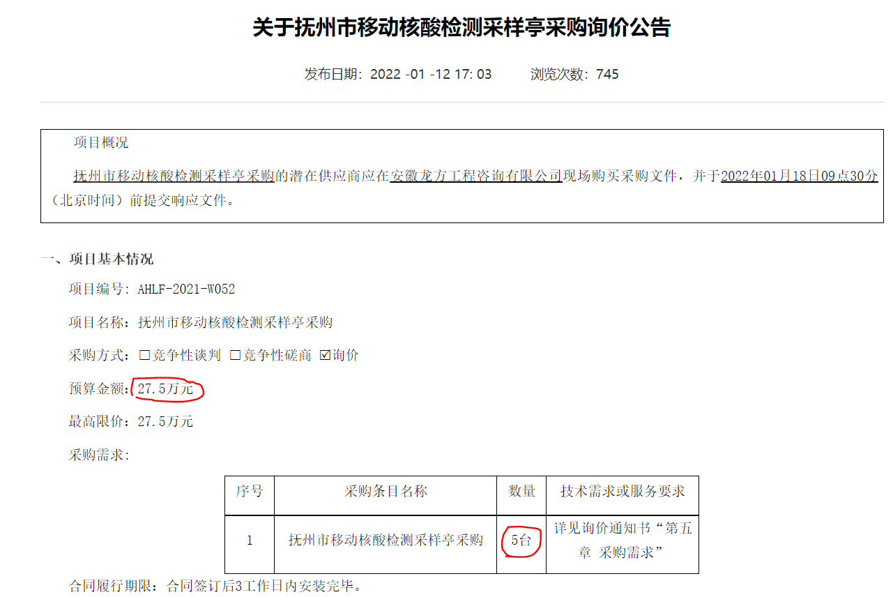 按照江西撫州市政府公告的採購詢價公告,每台核酸檢測亭擬採購價格為5.5萬元/台。