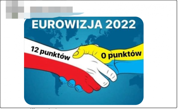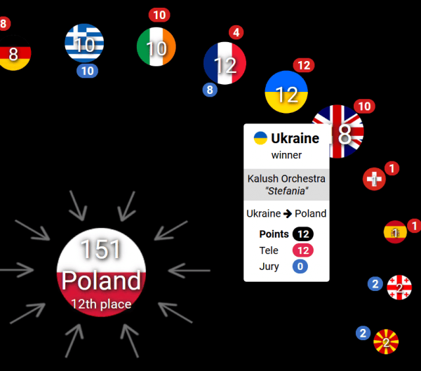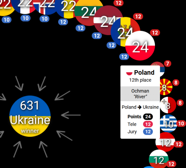 作為烏克蘭的鄰國波蘭,最近接收了大量來自烏克蘭的難民,並在這場比賽中給烏克蘭的參賽樂團投出了兩個12分的滿分——即波蘭觀眾和專業評審都打出了12分,總計24分。