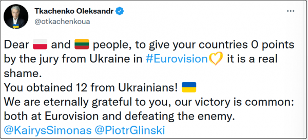 此事在烏克蘭網民中引發熱議。15日,烏克蘭文化和信息政策部長Tkachenko Oleksandr表示,對烏克蘭評委在歐洲歌唱大賽中給波蘭、立陶宛打零分感到羞愧,他認為應該給滿分12分。