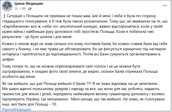 “怎麼會發生波蘭得了0分?我不知道為什麼。我們衷心感謝波蘭為我們做的一切……我很抱歉,我不知道別人的投票結果,我給了波蘭10分。”