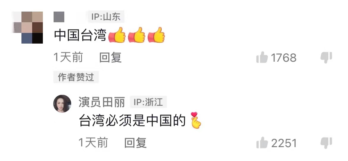 有粉絲為其視頻中的“中國台灣”點贊,田麗回覆對方,“台灣必須是中國的”。