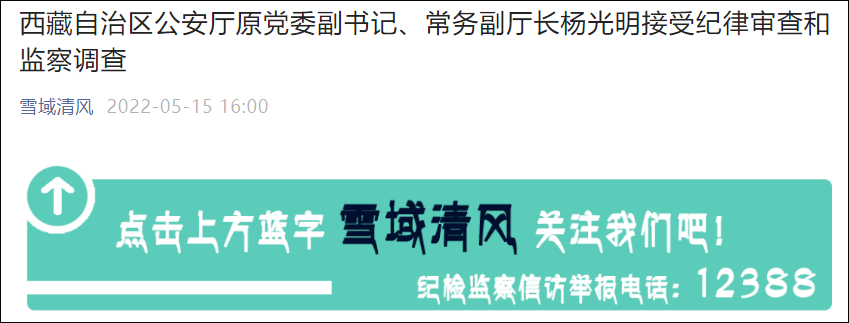 微信公眾號“雪域清風”5月15日消息,西藏自治區公安廳原黨委副書記、常務副廳長楊光明涉嫌嚴重違紀違法,目前正接受西藏自治區紀委監委紀律審查和監察調查。