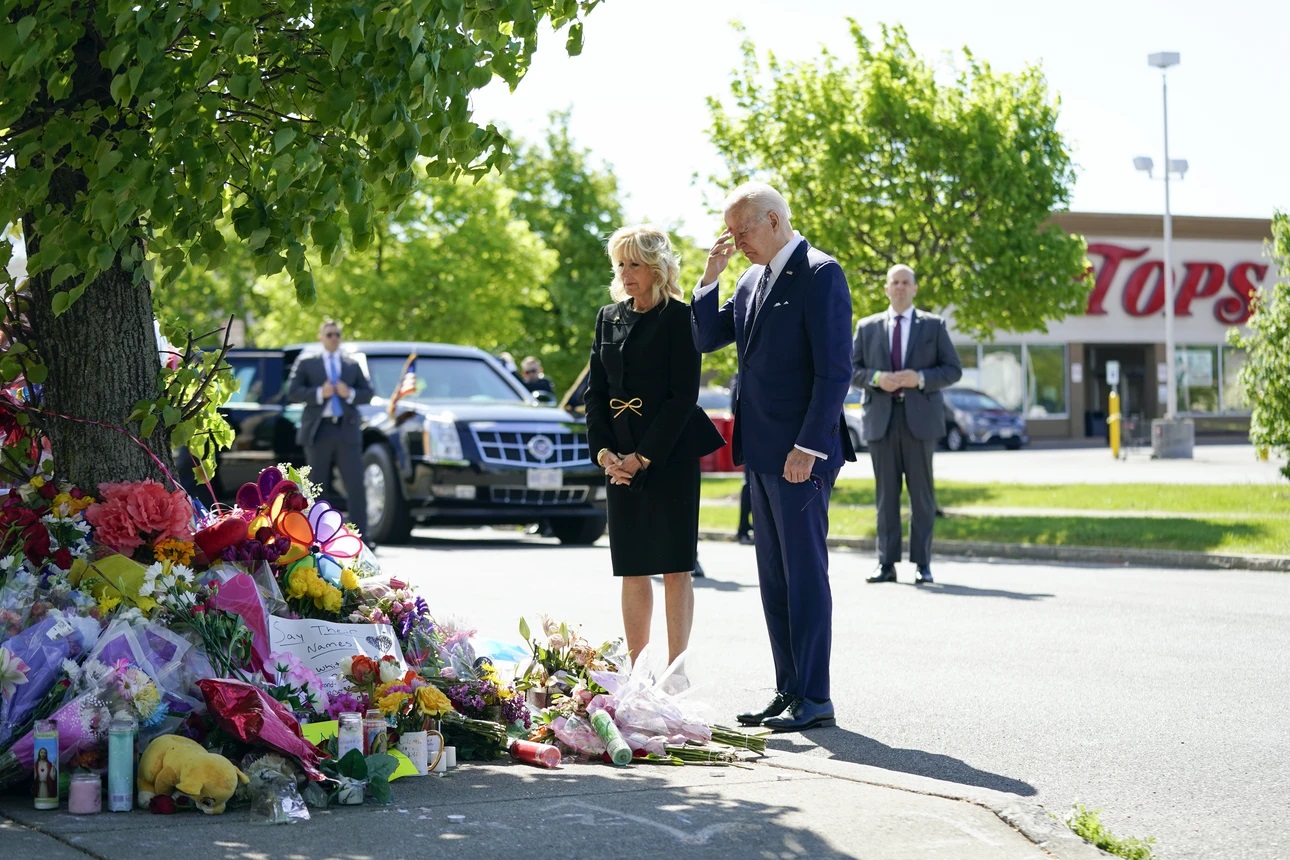 14日下午,一名18歲白人男子頭戴頭盔、身穿軍用裝備,“全副武裝”地進入布法羅市一個非洲裔聚居區的超市,並用半自動步槍向人羣開火,造成10人死亡,另有3人受傷。13名受害者中有11人是非裔美國人,有四人(其中一人死亡)是超市僱員。 當天,警方在逮捕嫌疑人佩頓·金德倫後,認定其作案動機為種族仇恨。目前,金德倫已被控以一級謀殺罪。