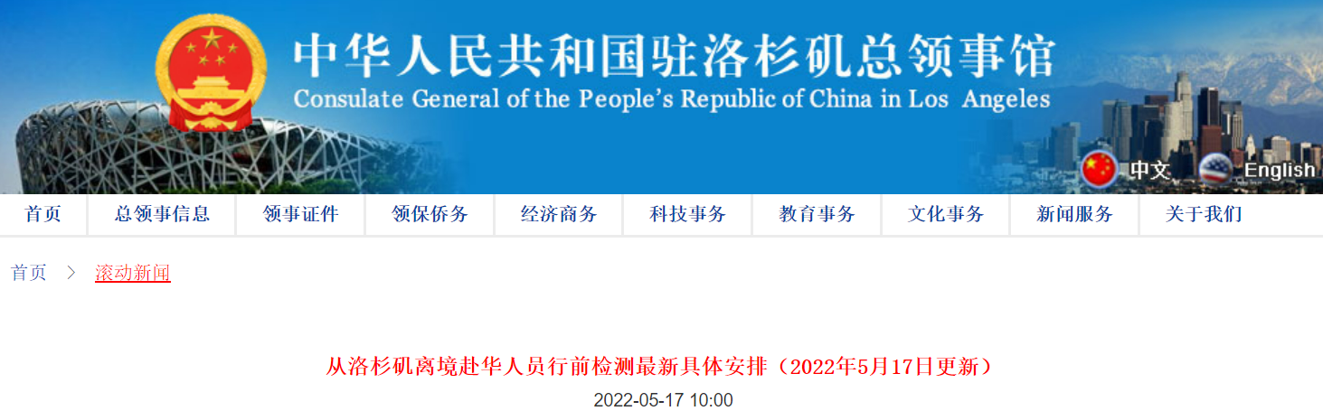 中國駐洛杉磯總領館5月17日更新從洛杉磯離境赴華人員行前檢測最新具體安排。